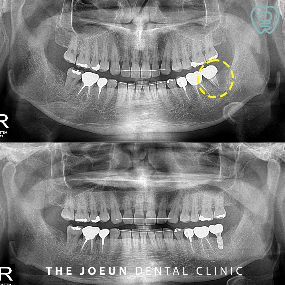 환자분께서는 정기 검진을 오셨다가 왼쪽 아래 신경치료 후 씌워둔 치아의 커다란 염증을 알게 되셨는데요. 가끔씩 피곤할 때 잇몸이 붓는 것 이외에는 불편함이 없으셨기 때문에 염증이 커다랗다는 설명을 들으셨을 때 매우 놀라셨습니다. 이미 잇몸뼈가 많이 녹은 상태라 발치 후 뼈이식을 하여 잇몸뼈의 회복 상태를 본 뒤 임플란트 식립을 진행하기로 계획을 수립하였습니다.