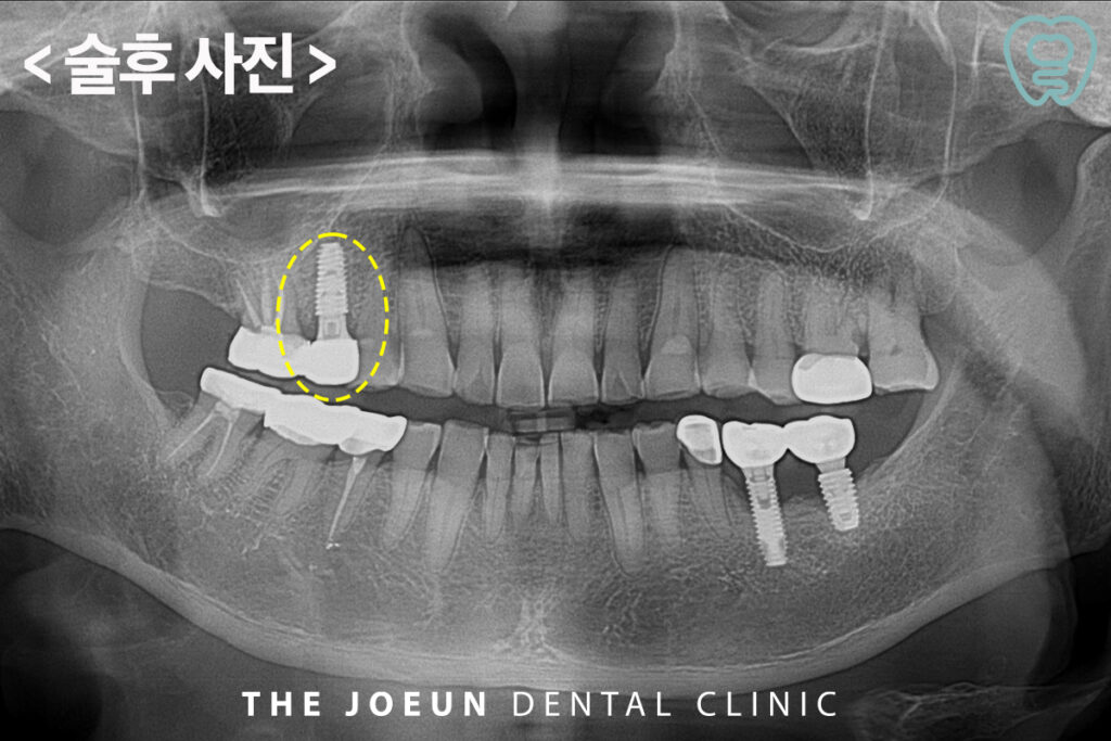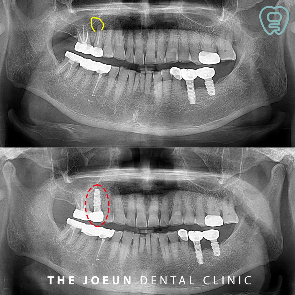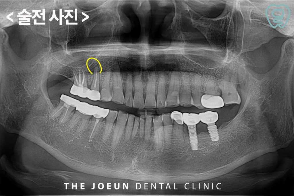 환자분께서는 오래 전 씌워두었던 오른쪽 위 어금니 부위가 조금 찝찝한 느낌이 드신다며 검진을 위해 내원해 주셨는데요. 외관상으로는 큰 문제가 없어 보였지만 두번째 작은 어금니의 뿌리 끝으로 커다란 염증이 관찰되고 있었습니다. 이미 신경치료 후 크라운이 되어 있는 치아로 발치 후 임플란트를 진행하기로 계획을 수립하였습니다.