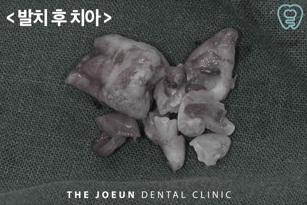 누워 있는 치아를 발치하기 위해 모두 조각 내어 발치를 진행하였습니다. 특히 매복 사랑니는 잇몸 밖으로 나오지 못하고 뼈 속에 묻힌 상태라면 절개나 뼈 삭제, 치아 분할 과정이 동반될 수 있고 아래턱의 경우 감각을 담당하는 신경과의 거리도 중요한 판단 기준이 됩니다.