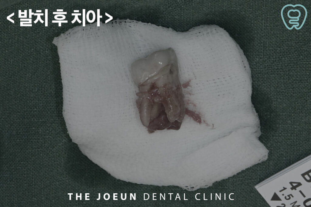발치 후 치아 뿌리에 붙여 있는 염증 덩어리가 명확히 확인되었는데요. 잇몸뼈의 골질이 약하다고 판단되어 임플란트 식립 후 충분한 기간을 기다려준 뒤 최종 보철물을 진행하는 것으로 하였습니다.
