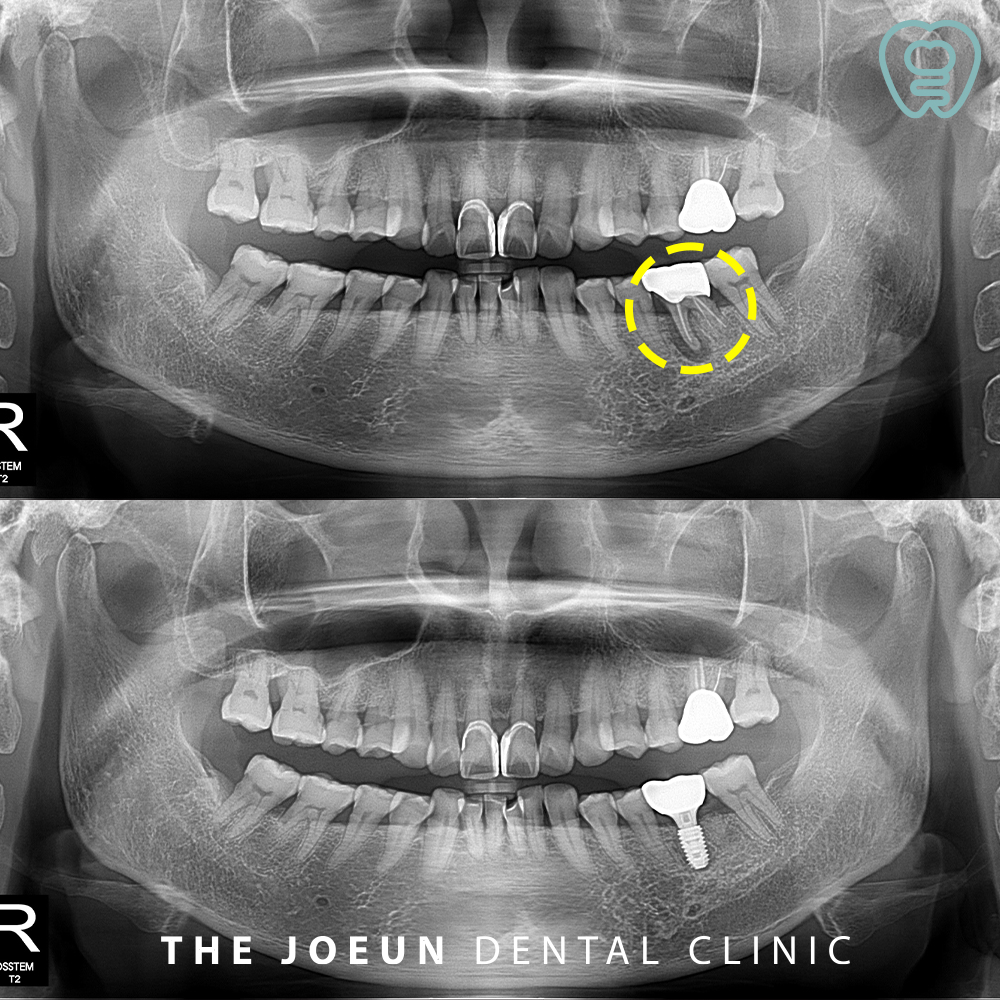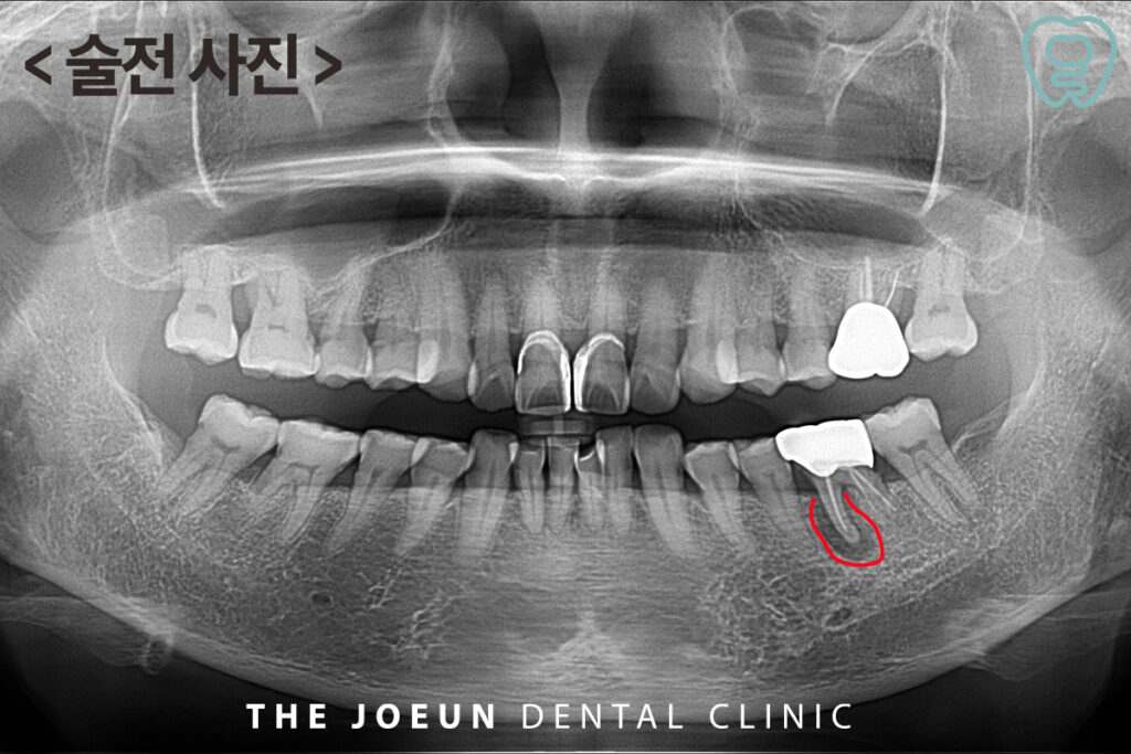 환자분께서는 오래 전 씌워둔 왼쪽 아래 어금니 부위가 씹을 때 힘이 들어가지 않고 잇몸이 붓는 느낌이 있으시다며 내원해 주셨는데요. 파노라마 촬영 시, 왼쪽 아래 첫번째 큰 어금니 뿌리에 커다란 염증이 관찰되었고 이미 치료가 되어 있는 상황이라 발치 후 임플란트 치료를 설명드린 후 진행하기로 하였습니다.