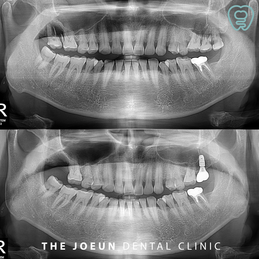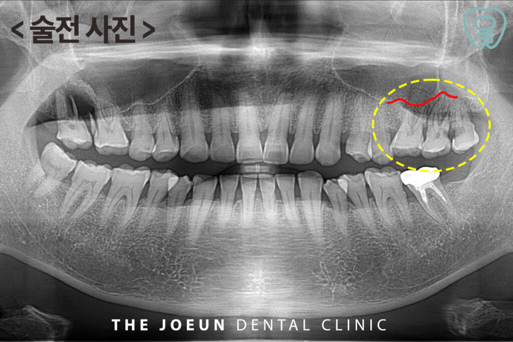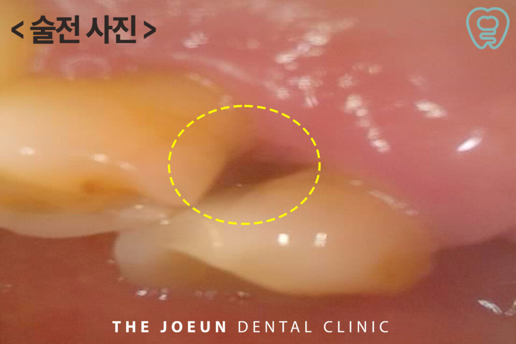 환자분께서는 왼쪽으로 음식을 먹을 때 음식물도 많이 끼시고 최근 들어 힘이 들어가지 않고 불편한 느낌이 드신다며 내원해 주셨습니다. 파노라마 사진 촬영을 해보니 가장 안쪽 사랑니와 인접치 사이에 심한 충치가 관찰되었고 이미 우식의 범위가 신경까지 침범하여 염증이 생겨 있었으므로 두번째 큰 어금니와 사랑니를 발치하고 어금니 부위는 임플란트 식립이 필요한 상황이었습니다. 따라서 치료 과정을 충분히 설명드린 후 계획을 수립하였습니다.