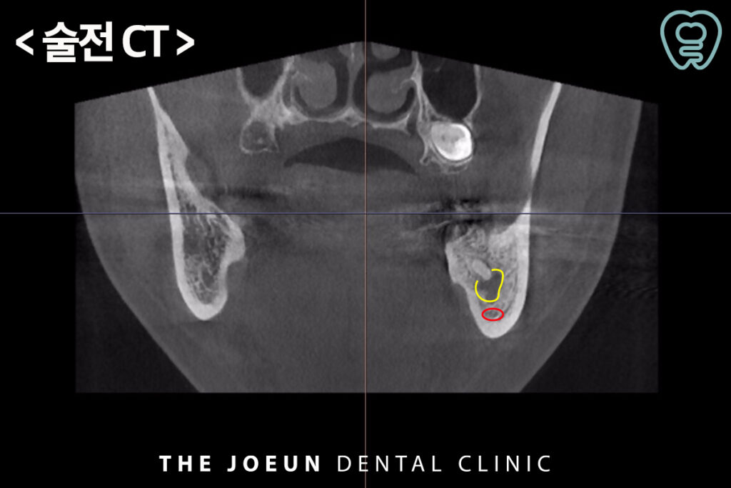 신경관과의 정확한 위치 관계 확인을 위해 3D CT를 촬영해 보았으나 신경관과 치아 뿌리의 염증이 매우 가까이 위치하고 있었는데요. 정밀한 검진을 바탕으로 발치를 한 뒤, 충분한 기간을 기다려 주어 임플란트 식립을 진행하기로 계획을 수립하였습니다.